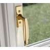 Doch trotz der klaren Formen sind Merga, Seginus und Izar sehr anspruchsvoll in der handwerklichen Produktion und wir freuen uns, Ihnen diese Highlights in unserem Sortiment anbieten zu können. Der warme Goldton des polierten Messings verleiht dem Fensterbeschlag eine luxeriöse Note. Sehr schön auf historischen Fenstern, ob im städtischen Altbau oder für die Gutshaus-Renovierung.